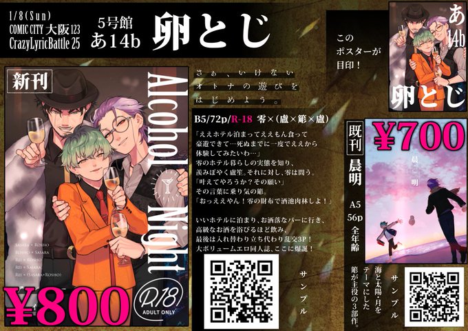 【お品書き】 1/8 CrazyLyricBattle25 5号館 あ14b サークル「卵とじ」 <頒布物> 新刊「Alcohol Night」 サンプル【twitter.com/hq1999/status/…】 既刊「晨明」 サンプル【pixiv.net/artworks/95378…】 何卒よろしくお願いします!