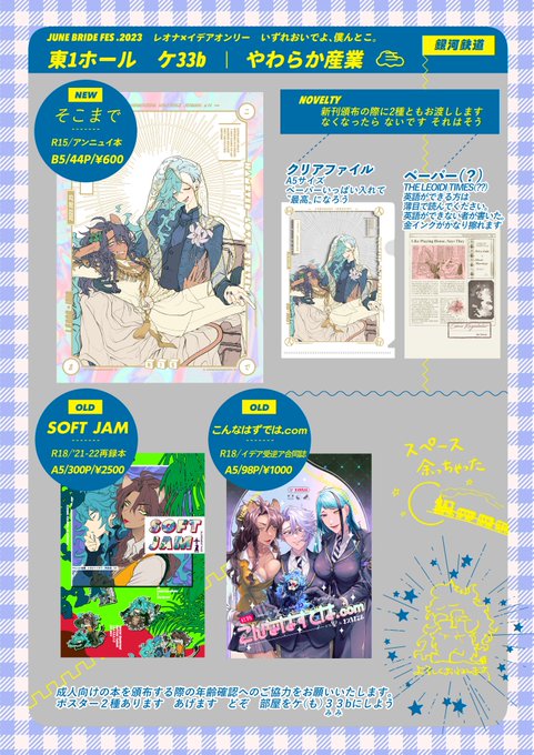 6/25 JB レオイデのオンリー 東1ケ33b🌁やわらか産業🌠🚂お品書きです🧱 ☀️新刊サンプル(twitter.com/hrgsm/status/1…) ☁️再録(twitter.com/hrgsm/status/1…) ☁️女子攻め合同誌(twitter.com/hrgsm/status/1…) ノベルティはなくなったらおしまいです よろしくお願いします🛫🛬