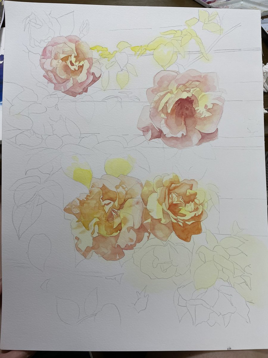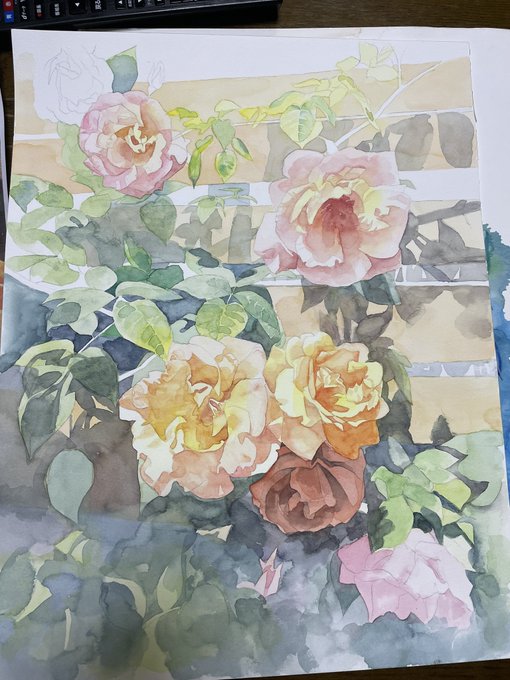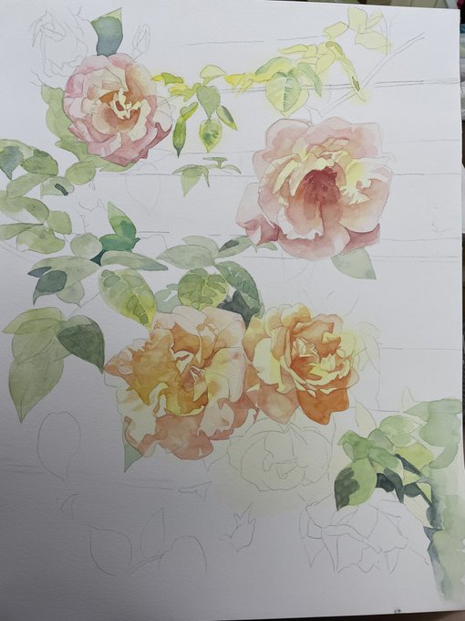 下書きの状態を写真撮らずに花をかなり塗り始めてしまった。途中から。 #水彩画 #Watercolor #バラ #薔薇 #rose
