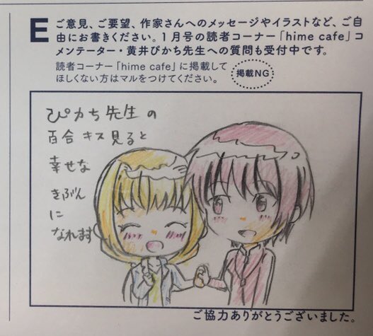 1 3 百合姫買ったらhimecafeにおハガキ採用されてた!不親切にカラーで描いちゃったのに採用してくださりありがとうございます。せっかくだから写真に撮ってたカラーをあげあげ。 #はやてら 18/11/19 23:45