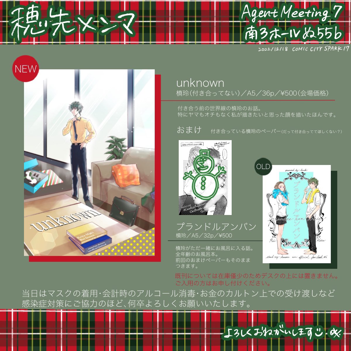 21 33 12/18 AM7のおしながきです🎄🎁🎅🌟 南3ぬ55bでスペースいただいています🍀 新刊「unknown」は在庫たっぷりあるのでゆっくりいらしてください🐌 既刊は在庫ってほどの量は無いのでデスクに出しません( Ꙭ) ご入用の方はお声がけ下さい✋ 当日は2枚目のイラストのポスターを貼りますので目印にどうぞ〜 22/12/17 14:59