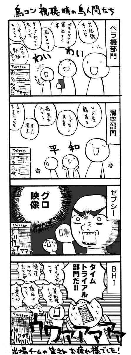 118 263 非鳥人間のフォロワーさんに「鳥人間のマンガ描いて」と言われたので描きました。 異論は認める。 アッ鳥人間コンテストは来週の9/2 (木) 夜7時オンエアです観てね。 21/08/26 21:56