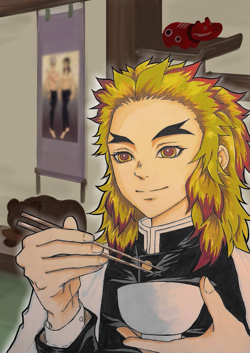 もう… どうしたらいいのかしら… 最高すぎる笑笑🤣 八時ちゃん(@Hatiji2nete )が背景つけてくれたぁ✨✨ 煉獄家にこのインテリアの部屋があるかと思うと🤣🤣🤣 なんでもない顔してご飯を頂く杏寿朗殿でした #鬼滅の刃イラスト #鬼滅の刃ファンアート #煉獄さん #鬼滅の刃絵描きさんと繋がりたい