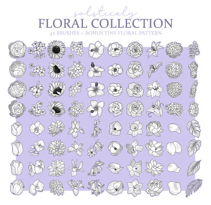 Introducing my new floral brush collection for CSP! Up for EA on patweon right now, public release March 11th :3 One of my most ambitious projects that took quite a bit but I'm very happy with how they came out!