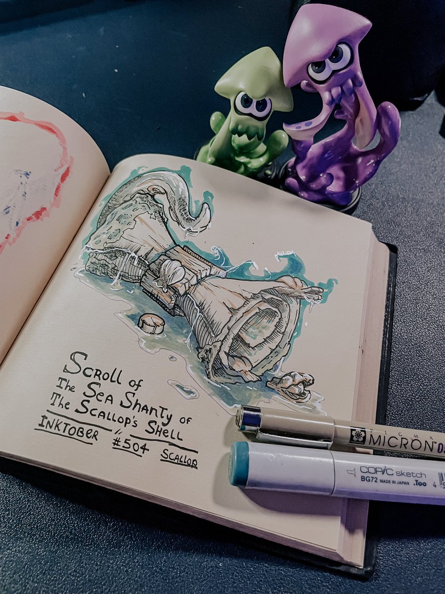The inktober theme of shallots resulted in this sea scroll of shell shanties. Really happy how it turned out! @SeaOfThieves hire me 😂 #inktober #inktoberart #inktober2022 #inktober2022day4 #inktober2022scallop #pirateart
