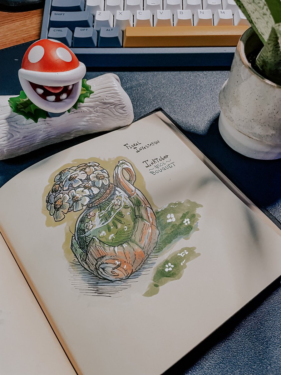 Inktober of the day for the theme of bouquet is a potion that when thrown makes flowers sprout everywhere in the vicinity (including the insides of someone ☠️) #inktober #inktober2022 #inktober2022day6 #inktober2022bouquet #inkart #dndart