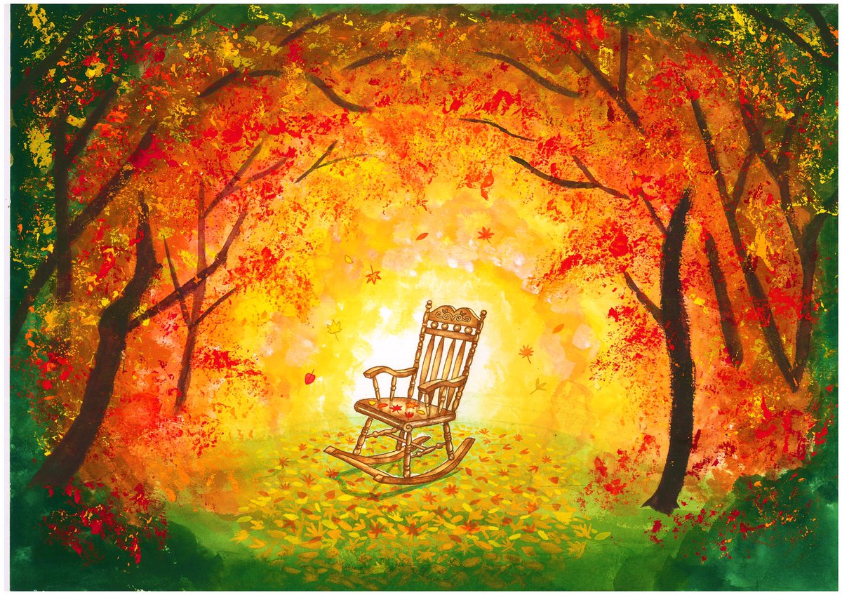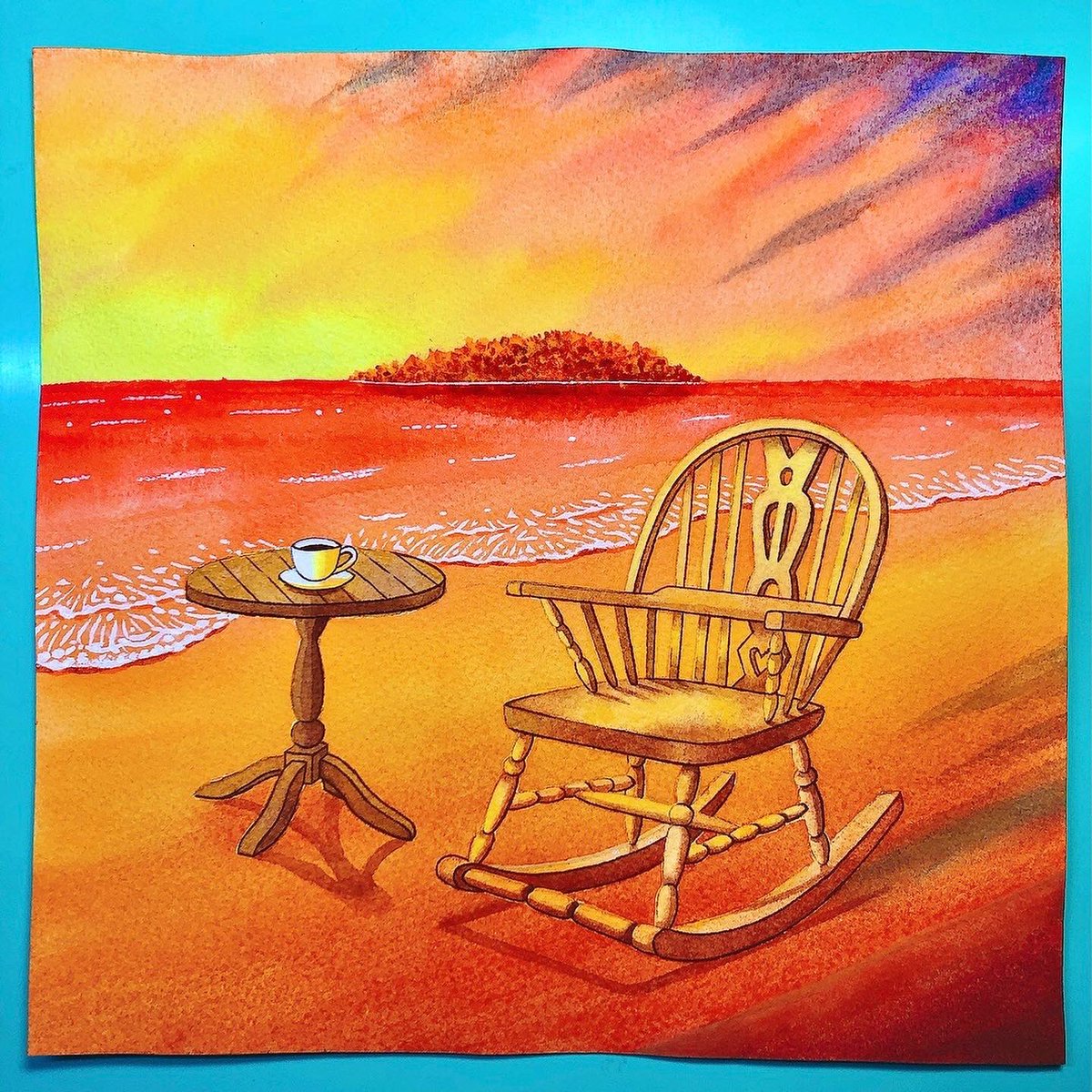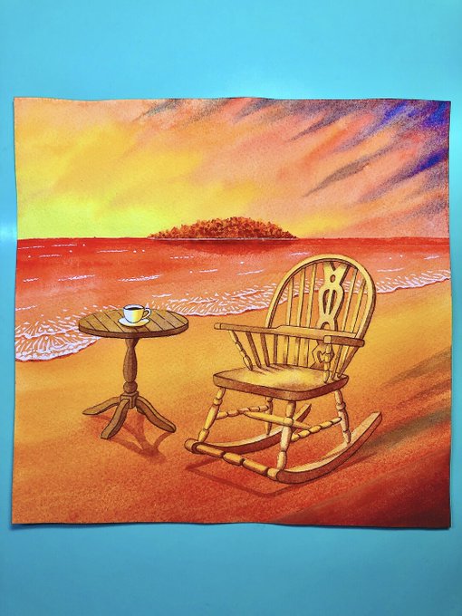 絵が完成しました❣️🎨 題名「Break time」☕️ 使用画材・アクリルガッシュ、筆、水彩紙 夕日の沈む海岸でロッキングチェアに腰掛け、コーヒーを飲むシチュエーションを描きました🎶🌇 #絵 #イラスト #絵描きさんと繋がりたい #絵柄が好みって人にフォローされたい
