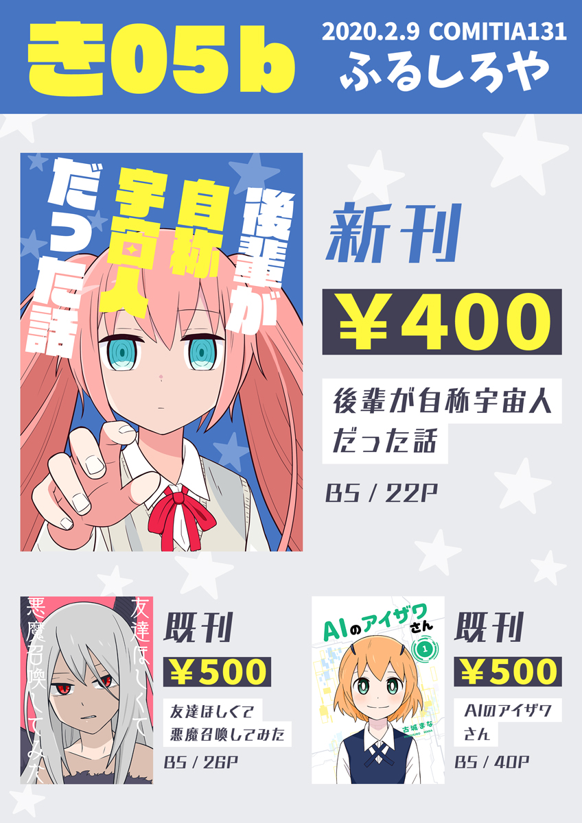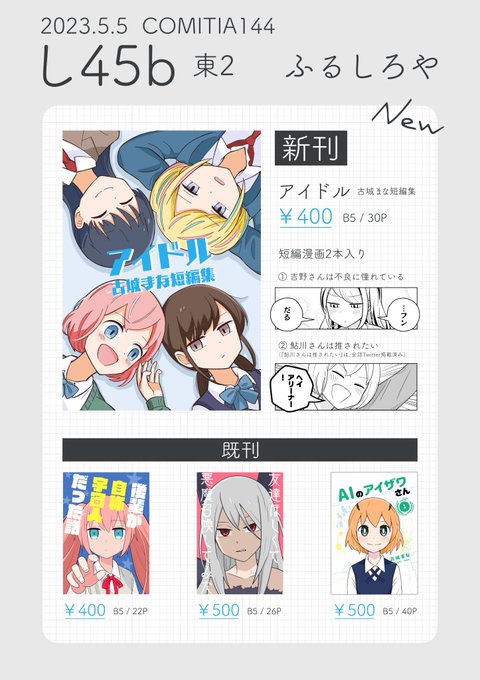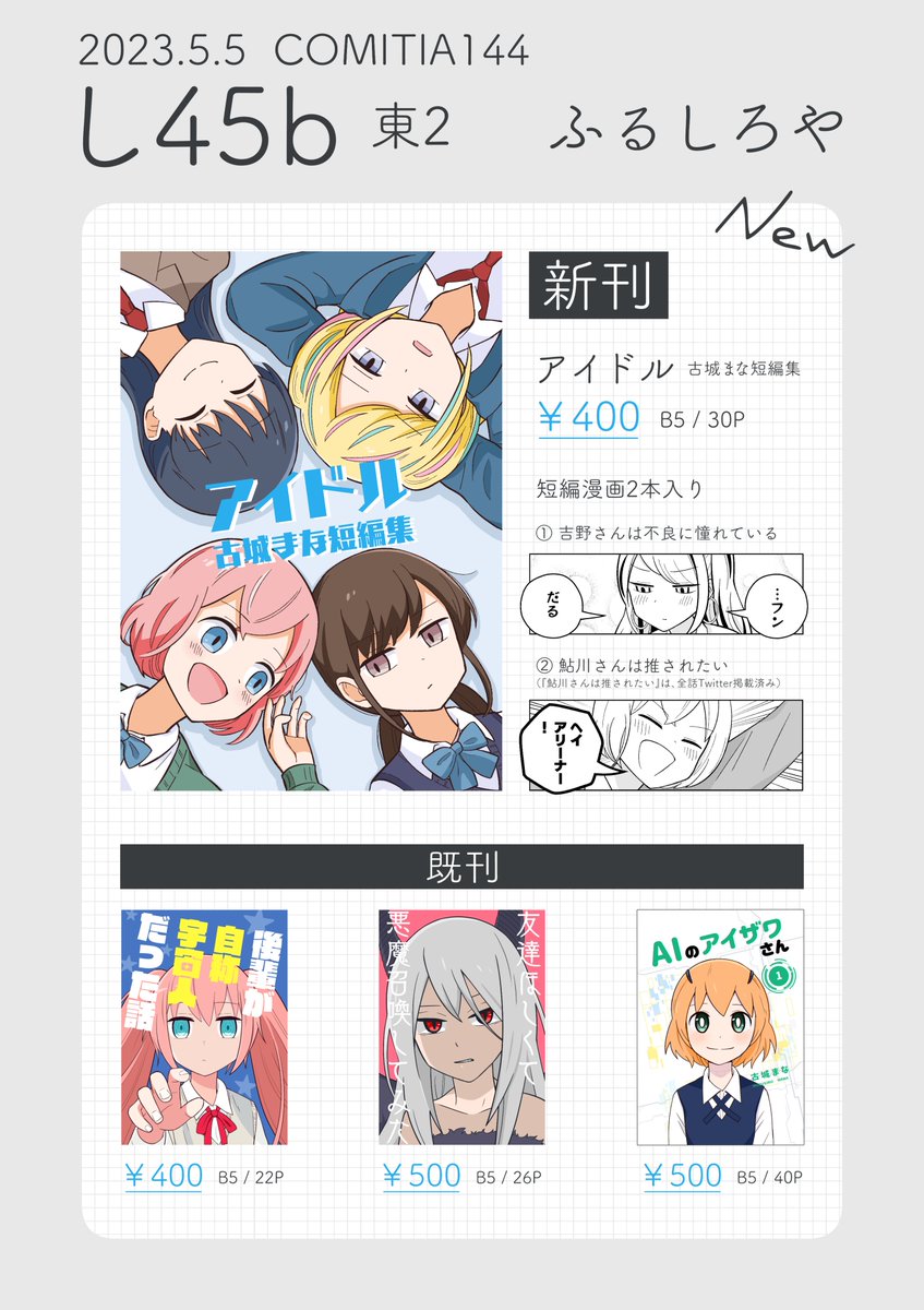 5/5コミティア144のお品書きです。 新刊は『吉野さんは不良に憧れている(8P)』と『鮎川さんは推されたい(12P)』の2本の漫画が入った短編集になります。 東2ホール【し45b】でお待ちしています。よろしくお願いいたします! #コミティア144 #COMITIA144