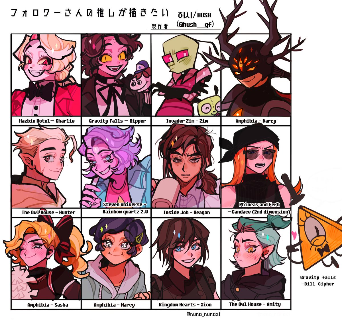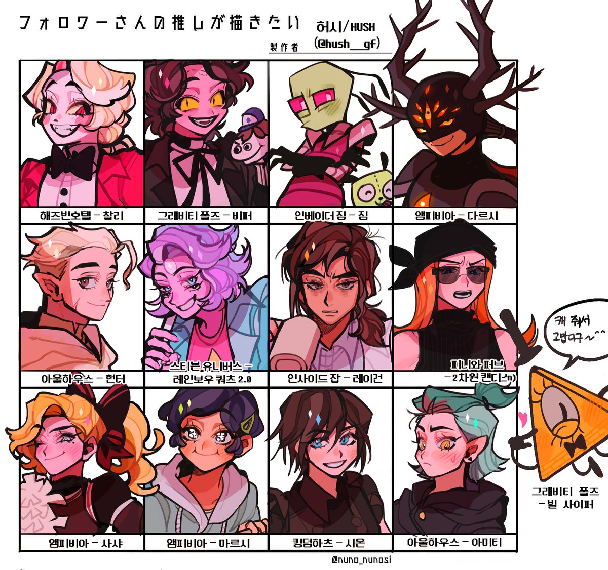캐릭터 주셔서 감사해요~!! ☺️💖💖 해시태그도 달아봄^^ #HazbinHotel #InvaderZim #theowlhouse #gravityfalls #insidejob #StevenUniverse #PhineasAndFerb #amphibiafanart #amphibiaspoilers #kingdomhearts