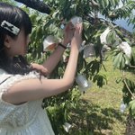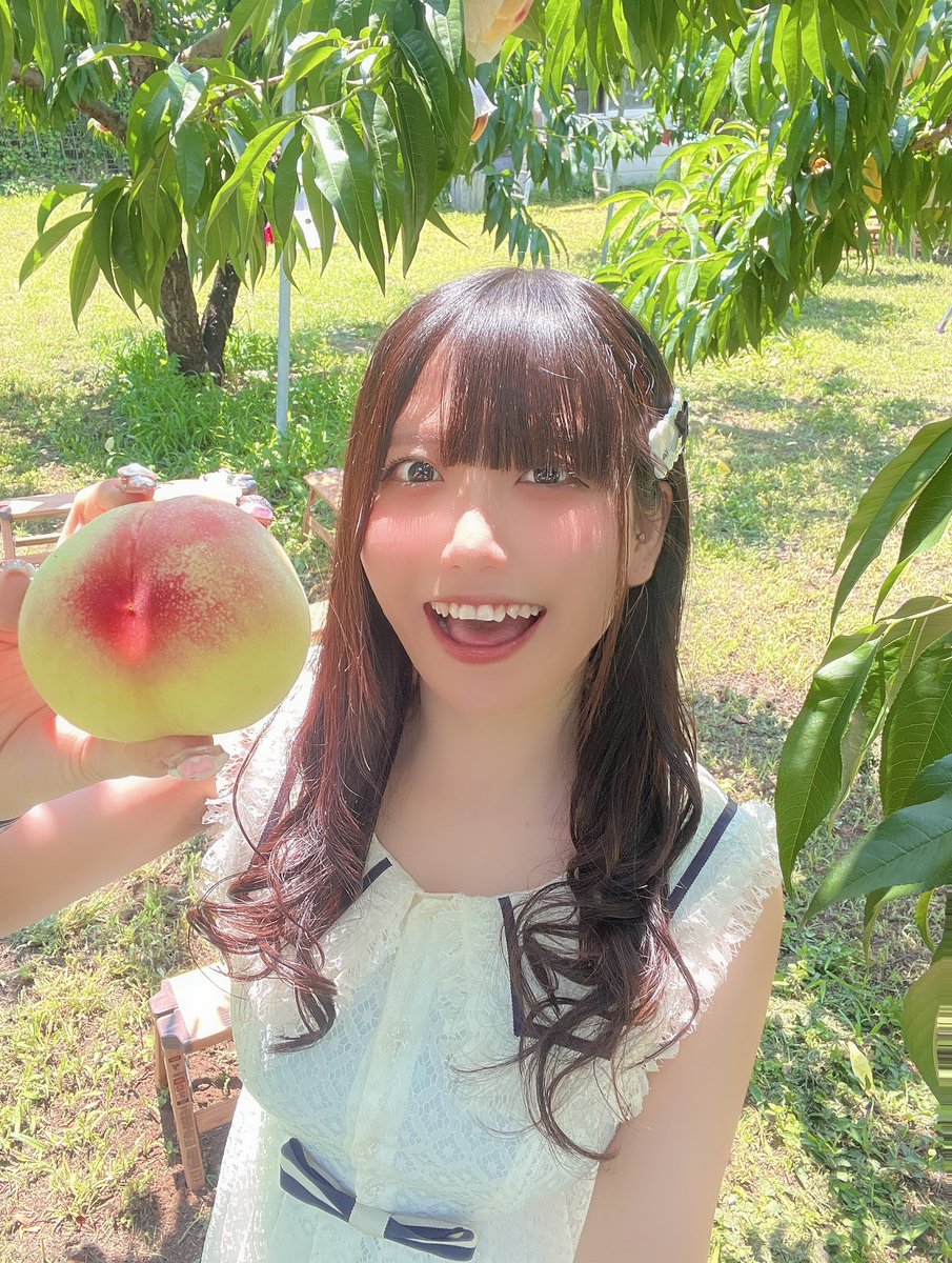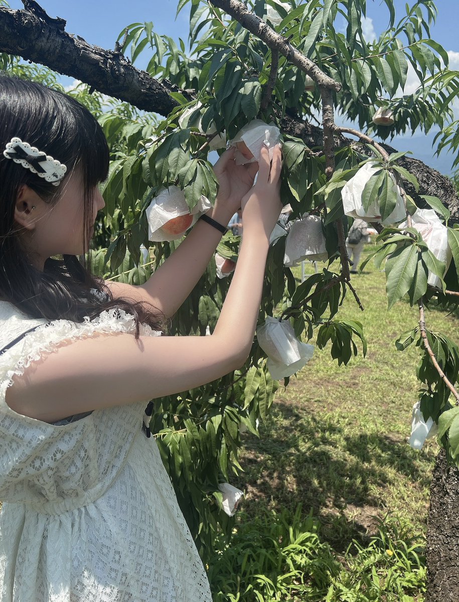 桃狩りしてたら直射日光で暑くてほっぺが桃色になった🤒🍑