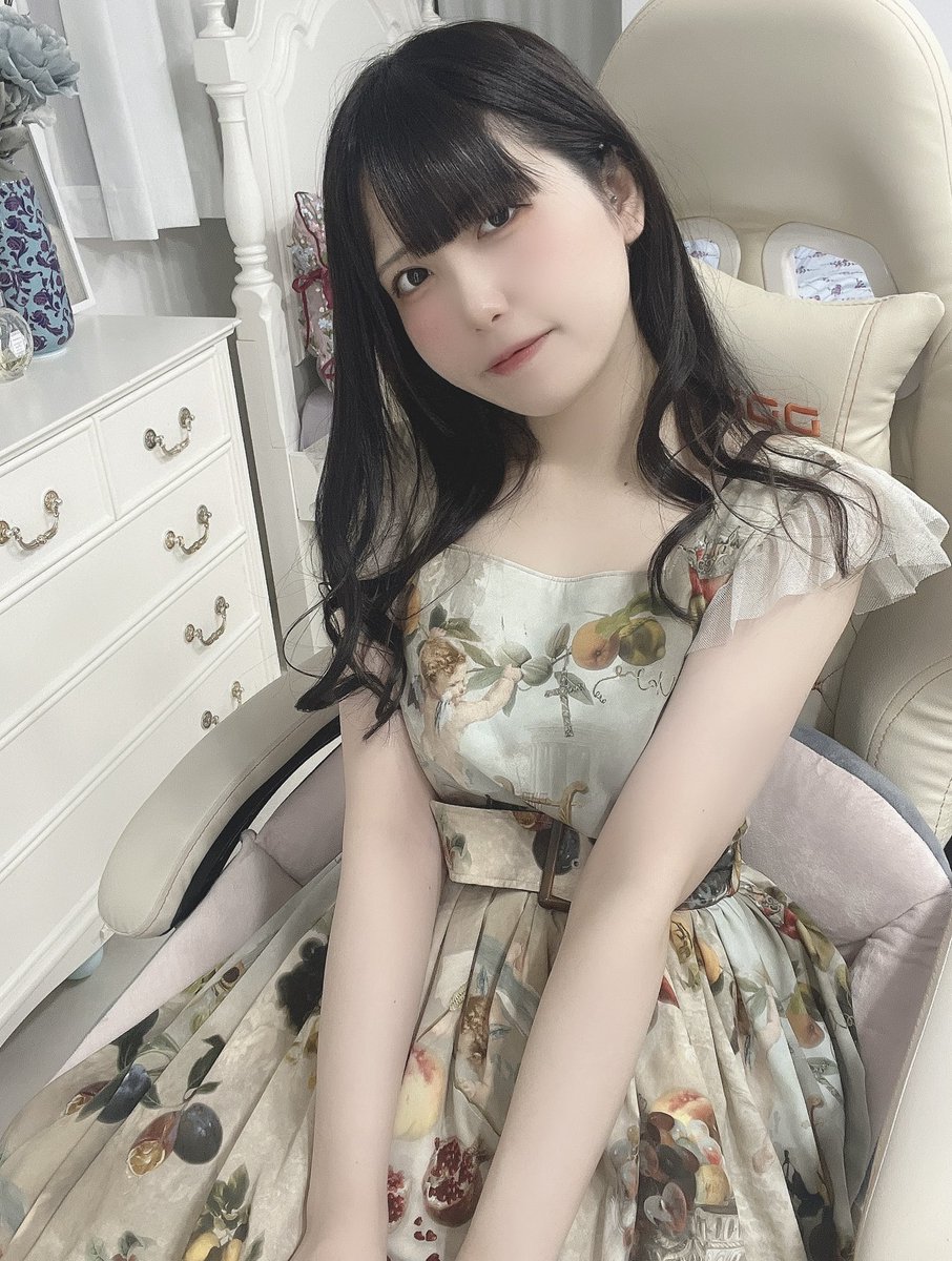 22 305 このワンピースが自分で持ってる洋服の中で結構お気に入りでブラウス無しでも着てみたんだけどもしかして無しの方が可愛いかもと気付いてしまった 色味も肩のフリルも果物もどれもこれも好きなの🍇🍐 23/05/13 11:15