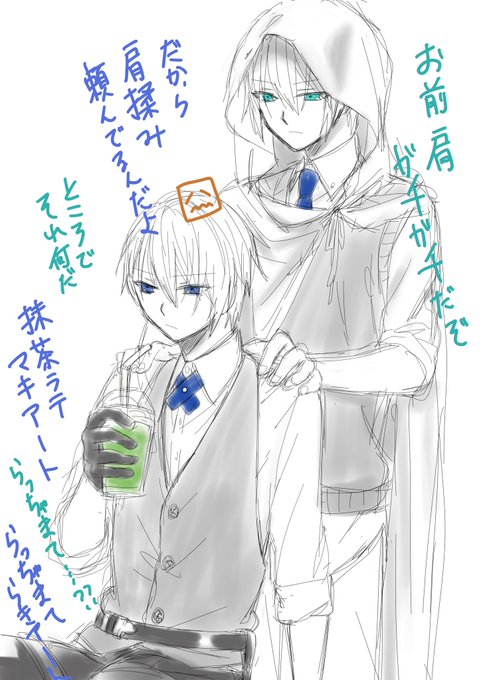 #映画記念長義カマーベスト祭り 素敵なタグに乗っかる(笑)本編関係ないの面白い 事務仕事終わりにのリフレッシュ。国広による馬鹿力肩揉みほぐしは長義と長谷部に必要かもしれない。 お飲み物はらっちゃまてラキアート(抹茶ラテマキアート)
