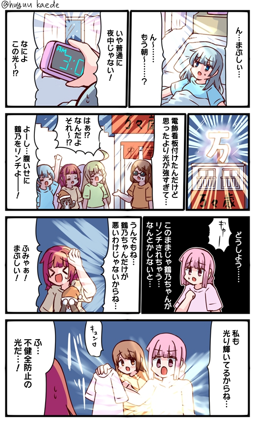 かもれと学ぶ「まぶしい!」某SNS運営会社の看板がすごい光輝いて近所迷惑って記事を見て描きました。 三人ともお誕生日おめでとう #秋野かえで生誕祭 #水波レナ生誕祭 #十咎ももこ生誕祭