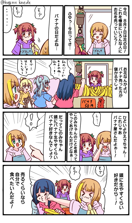 かもれと学ぶ「独占したい!」もう過ぎてるけど8月7日について描きました。花とバナナの両方を満たすキャラがいるとは珍しい 三人ともお誕生日おめでとう #秋野かえで生誕祭 #水波レナ生誕祭 #十咎ももこ生誕祭