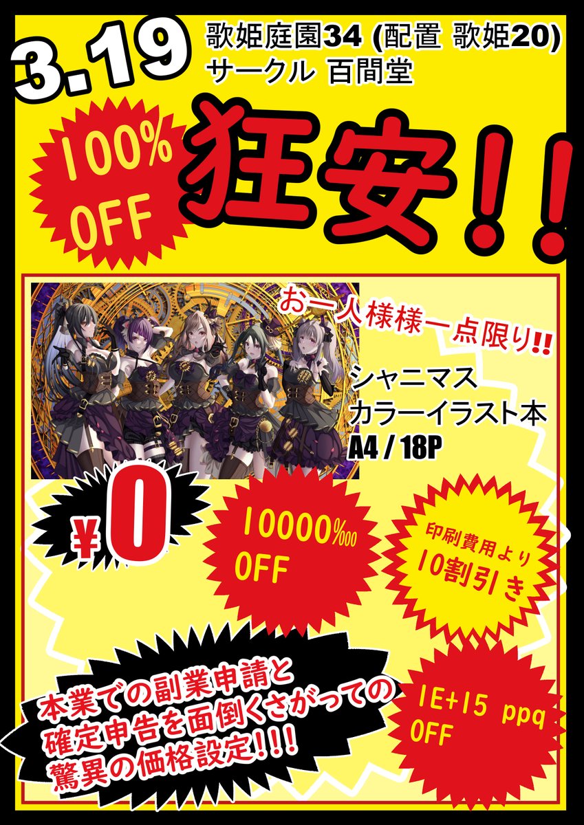 50 95 歌姫庭園34にてシャニマスのカラーイラスト集を頒布します。 同人イベント初参加です。 添付の画像はお品書きです。 #歌姫庭園34 23/03/05 20:07