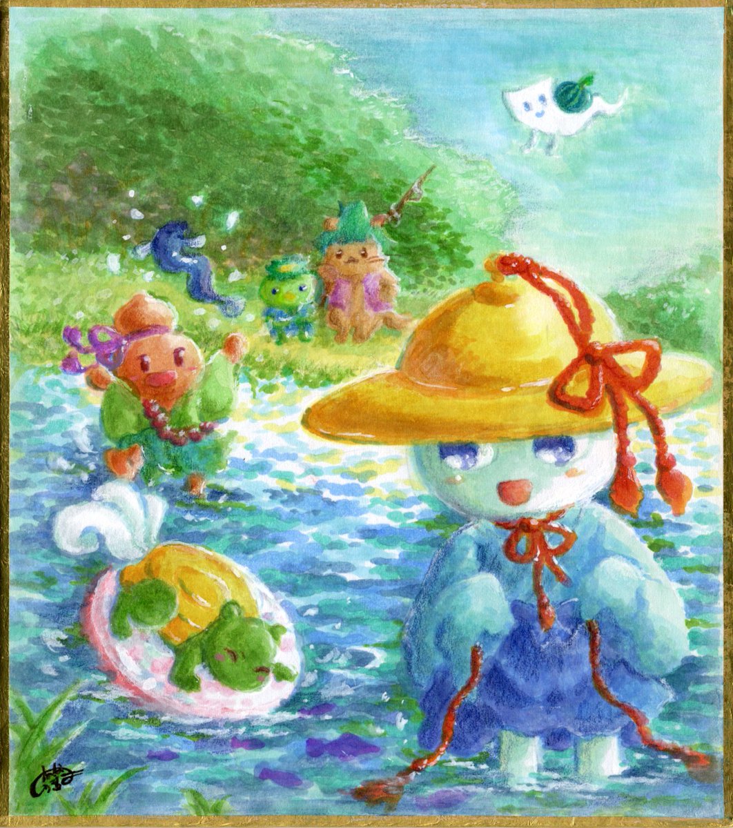 野原でお昼寝(改) #イラスト #色紙 #妖怪 #コピック #色鉛筆 #透明水彩