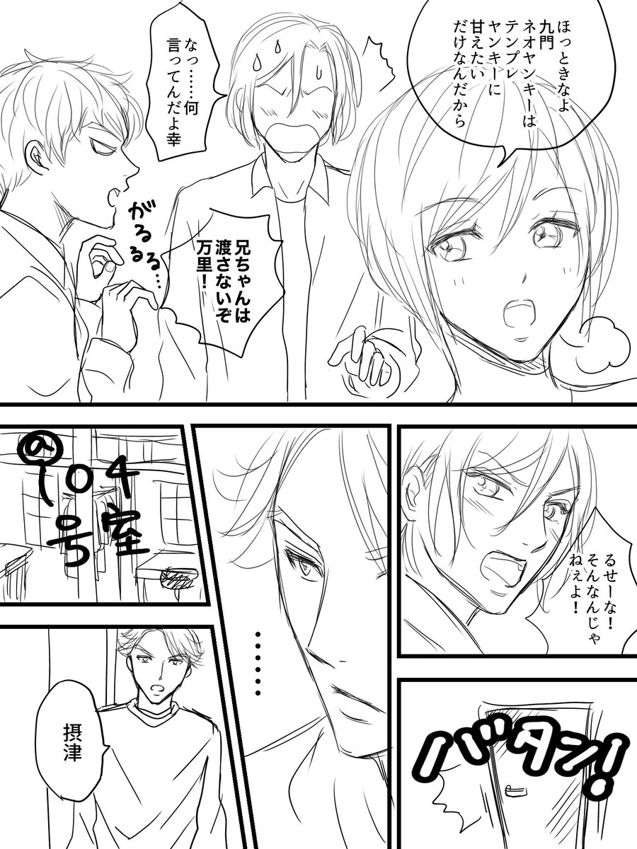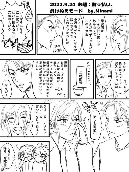 本日もワンドロ開催ありがとうございます。 お題:酔っ払い、負けねえモード 前も似たような話を描いたように思いますが、今回は万里も酔ってます!! 飲み明かしてくれ兵摂!!! #兵摂版深夜のワンドロ一本勝負 @hyose__60