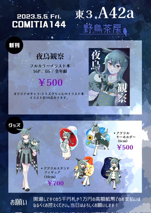 2 5 🌟5/5COMITIA144のおしながきです🦉 ミミズクちゃんのフルカラーイラスト本とアクスタ、アクキー4種を持っていく予定です!よろしくお願いします! 23/04/26 18:52