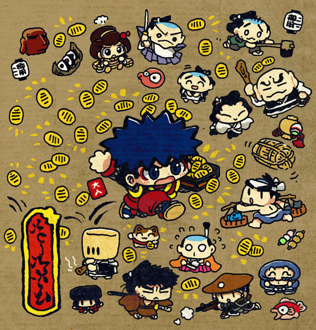 五の日だからがんばれゴエモンのイラスト描く。ゴエモンとからくり道中の面々。#五の日はゴエモンでぇ