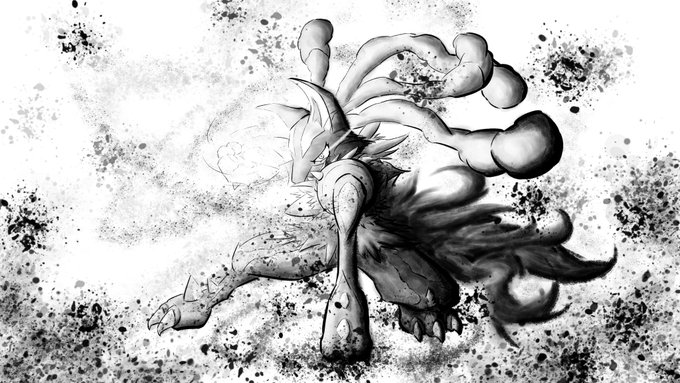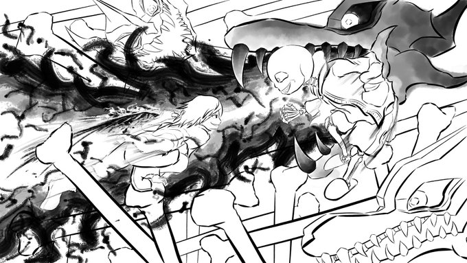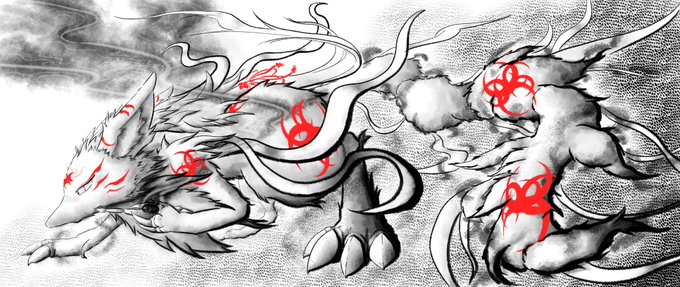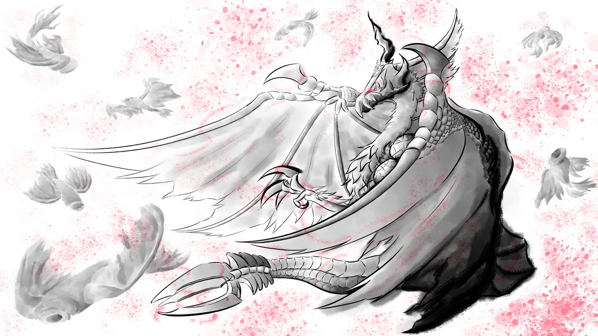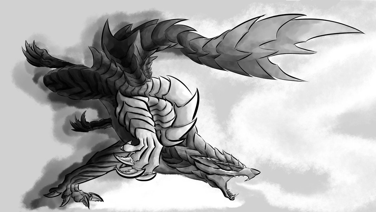 1 12 #イラスト 墨絵風で、モンスターハンターよりメル・ゼナです。 モノクロに差し色で一色だけ入れるのは有りかもしれません。 22/07/22 18:44