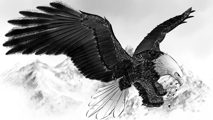 2 21 #イラスト 墨風でハクトウワシ完成版です。 羽と胴体は同じブラシ一本で仕上げてます。 こうして描いて見ると鷲って脚ゴツいですよね。 22/06/23 18:42
