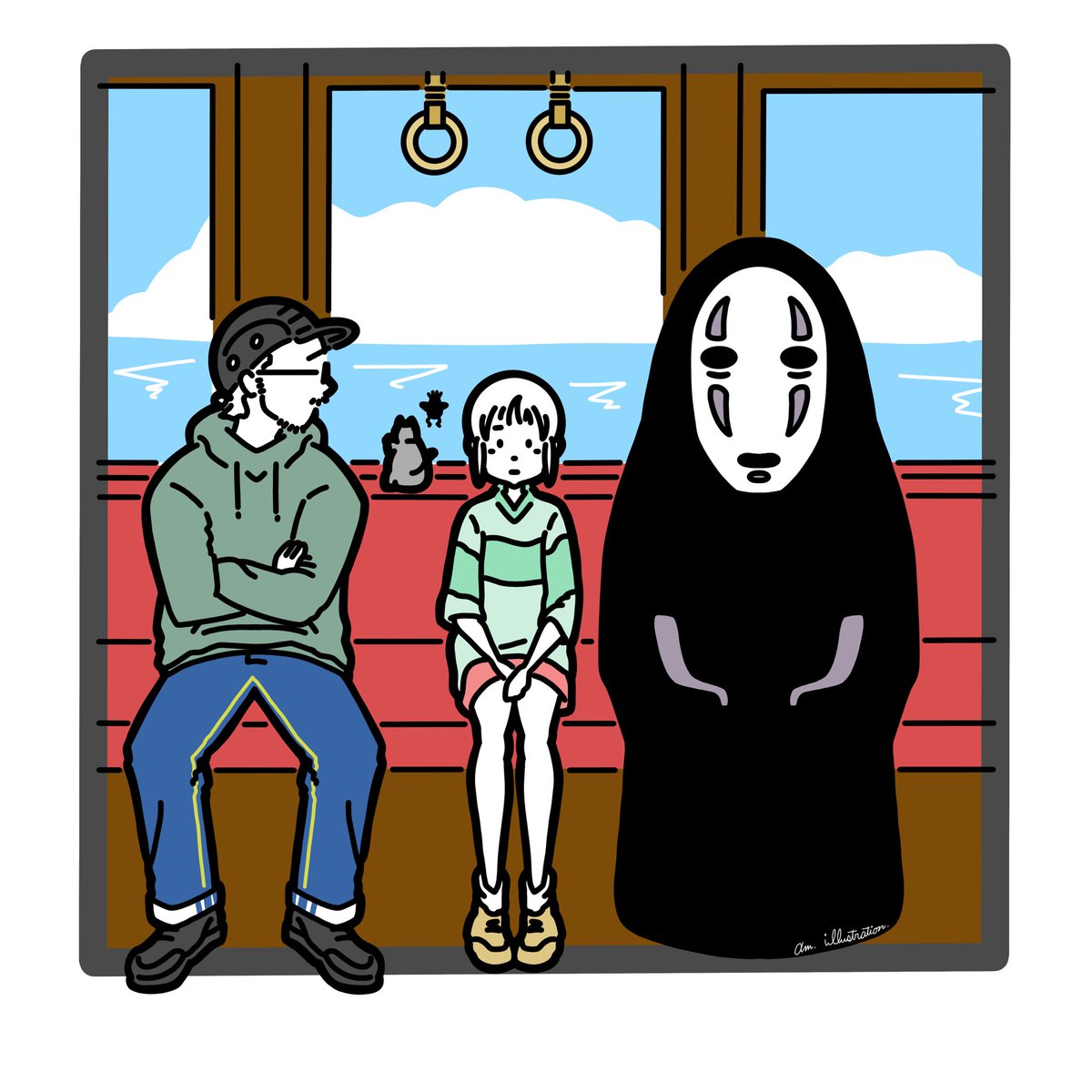 ✒︎#お邪魔しますシリーズ ねぇ、この電車ってどこいくの? 僕も一緒にいっていい? え?いいって?ありがとう! じゃぁお邪魔しまーす! #illust #illustration #Illustrator #artwork #lineart #イラスト #イラストレーター #ラインアート #挿絵 #ジブリ #ghibli #千と千尋の神隠し #カオナシ