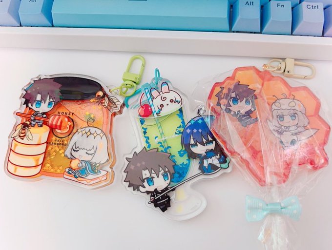 25日のぐだオベオンリーで持っていくアクキー3種類 ウォーターキーホルダーとキャンディキーホルダー! ハチミツ瓶とメロンソーダは中身が動くよ🍯🍈 キャンディはホログラム加工とドーミング加工付きでキラキラツヤツヤ〜🍭 こっちはラッピングした状態で頒布予定〜 twitter.com/i/web/status/1…