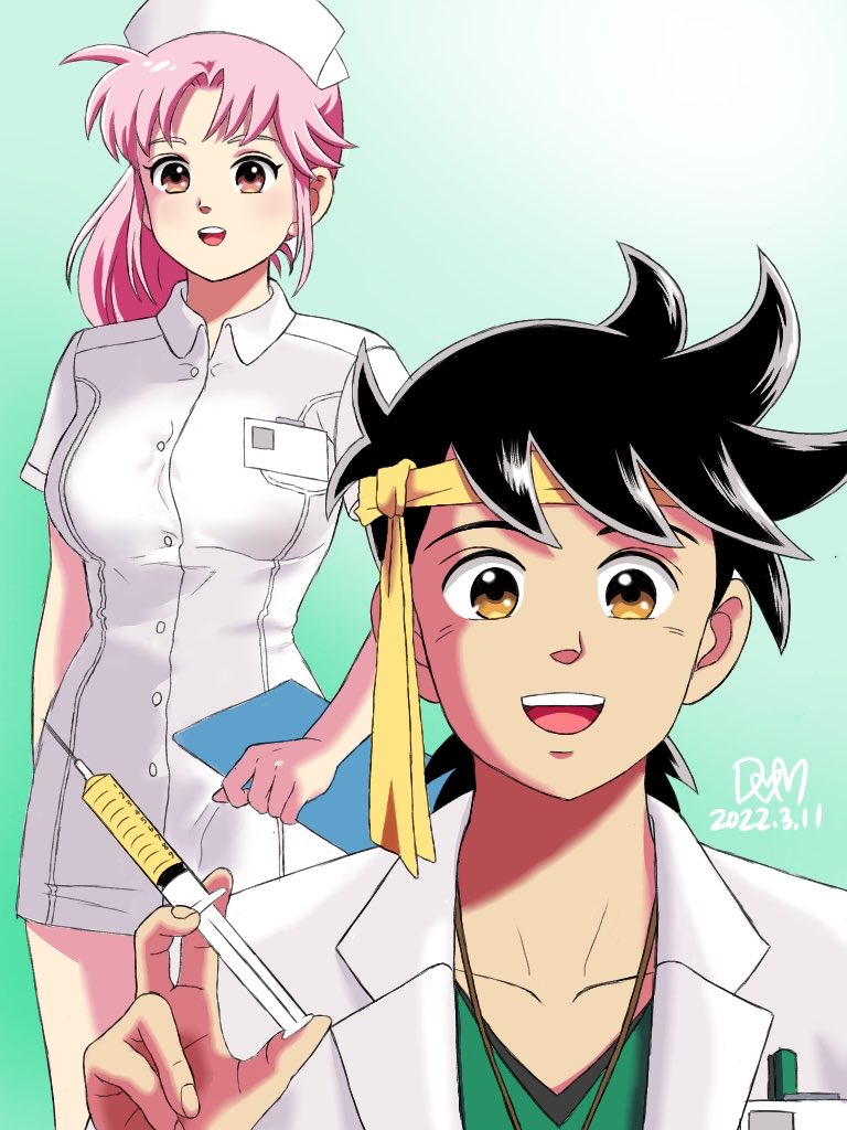 #ポプマ202203転職 #ぽぷまつり202206 ぽぷまつり3月のお題「転職」 ポプマのふたりがお医者さんになったら…? を描きました。 器用なポップは注射が上手そうだね😊 優しいマァムは看護婦さんがピッタリ😍 ワクチン接種の為に、お休みを返上して働いている 医療従事者の皆様に敬意を表して…✨