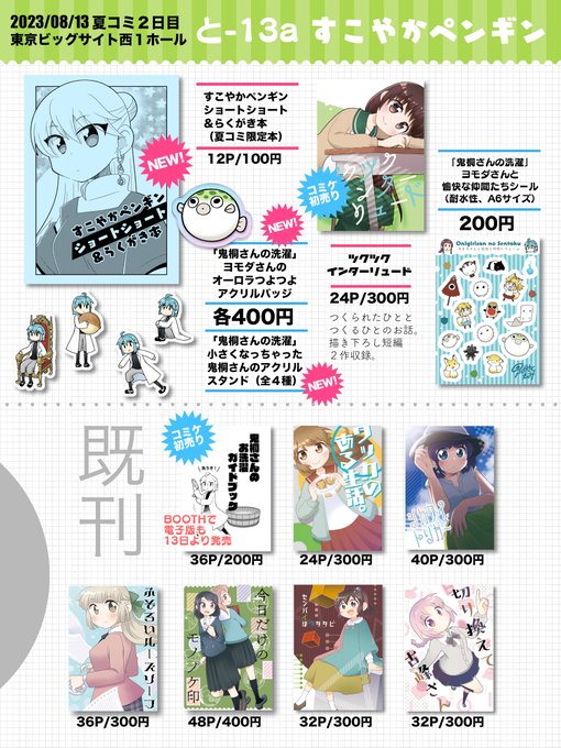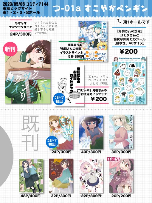 5月5日のコミティアおしながきです。 つ01a「すこやかペンギン」で参加します。 新刊ほか、あの洗濯本も少しだけ置きます。 気軽にお立ち寄りください〜 #COMITIA144 #コミティア144