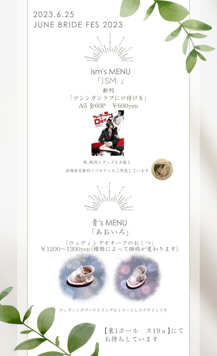 6/25【JUNE BRIDE FES.2023 鏡も知らぬ恋】のお品書きになります。ジュンブラなので結婚式風に作りました😊 私は新刊を、青さんはぬいさんのおくつを販売します❗️ 引用で新刊サンプルつけてます〜✨ 当日はよろしくお願いします❗️ twitter.com/i_shi_twst_ism…