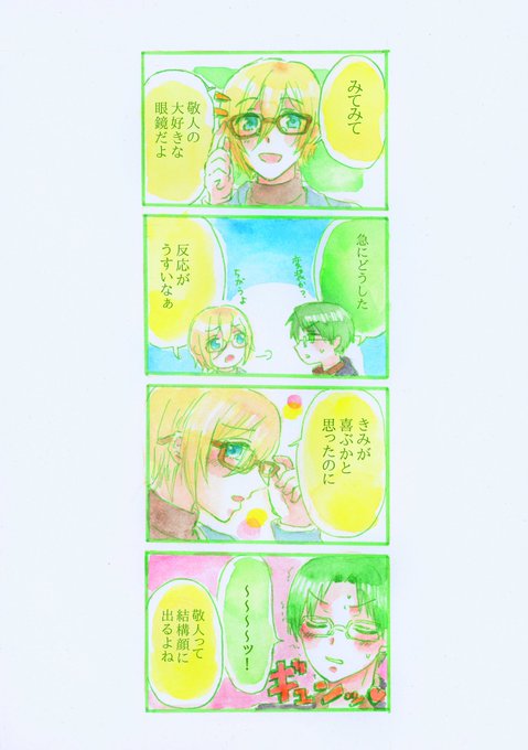 「眼鏡を10も20も持ってる眼鏡好きだけど、好きな相手が眼鏡かけた姿に興奮するとかそういうタイプではない蓮巳敬人」というツイートに対するほたてさんのリプが最高すぎたので4コマ描きました twitter.com/httkhm/status/…