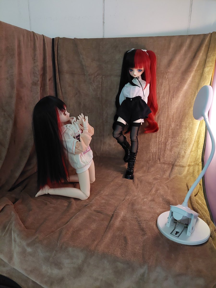 りんちゃん大変身の撮影現場📸✨ 起きたばかりのゆきちゃんも来てくれました😴☕️☀️ その後、2人は勝手に小さな演劇を始めました🤔🤣 #FebColors_doll #MDDはいいぞ #うちのこかわいい