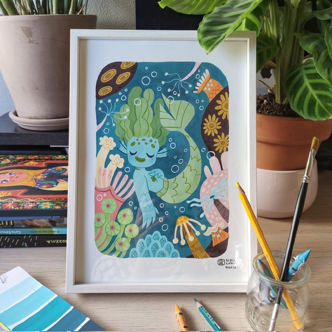 #Mermay 03 - Axolotl. In the swamps there are also little animals that seem to be from another planet. Perhaps axolotls are and that's why they feel curious about mermaids 🤔🧜♀️ This illustration is available, + info on Instagram 😉🌟 #mermay2022 #mermaychallenge