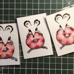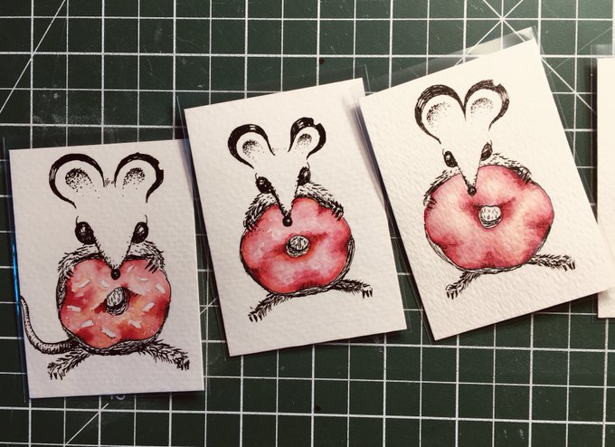 Busy for the past days making an army of "Donut Rats". Inspired by a character I created during #inktober2020 . They're made with India ink and watercolour on Strathmore cold pressed 300g paper, 2.5x3.5in (size of a baseball card) each.