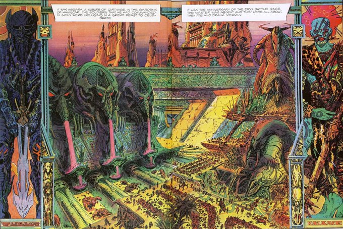 They were laughing still when suddenly, a light shone from the highest balcony of the palace, a woman, Hamilcar’s own daughter, appeared in a doorway. Then the temple itself came toward them…and the din fell silent