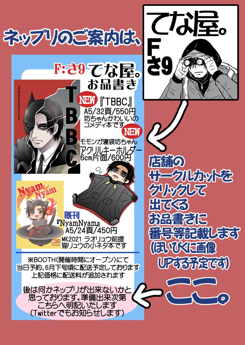 17 44 明日のレカペどうぞ宜しくお願いします! 🦇新刊+新グッズございます(BOOTHは開場時間に合わせてカートオープン予定) 新刊サンプルpoipiku.com/3938772/686228… ネップリもご用意できそうなので開場時間前にお品書き差し替えておきます #レカペ2206 #ザバザバ2022 22/06/03 21:46