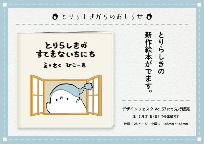 43 102 🌟新作のお知らせ🌟 とりらしきの絵本をつくりました。 デザインフェスタVol.57にて先行販売、後日通販も予定してます。 頑張って描いたのでぜひ見てほしいです🐤 #デザフェス57 23/04/30 19:44