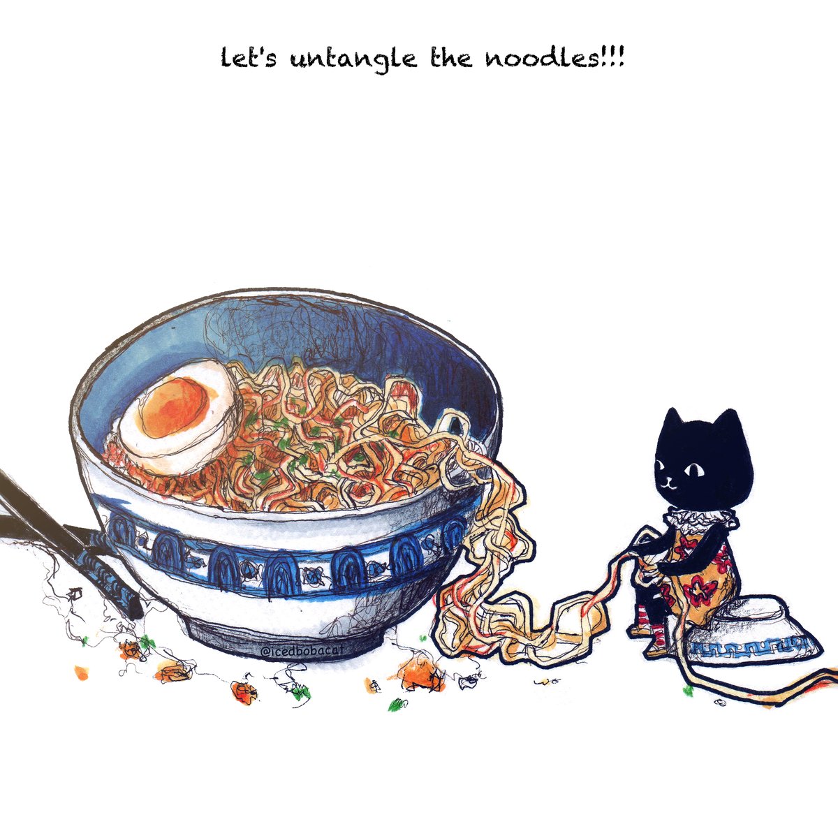29/11/22 Cat untangling noodles 🍜🍜 #icedbobadraw #イラスト