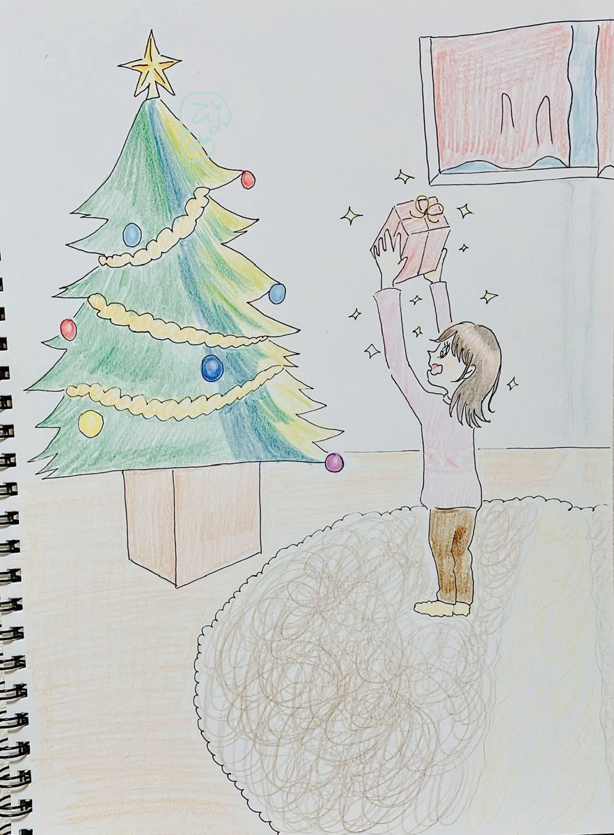 1 4 少し早いかもですけど #クリスマス の絵です。 小さな子がプレゼントを持ち上げて 喜んでいる様子をイメージして描きました! #イラスト #アナログ 22/12/23 16:55
