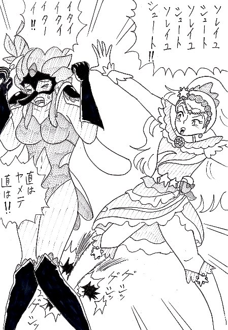 #プリキュア週ドロ お題が「プリキュア衣装交換」 EXお題が「先週描いた二人のプリキュアの衣装を交換」ということでこうなりました。 でもこの二人はカラーで描かないと、何が変わったかわからなくて全然伝わりませんね。 困ったもんです。
