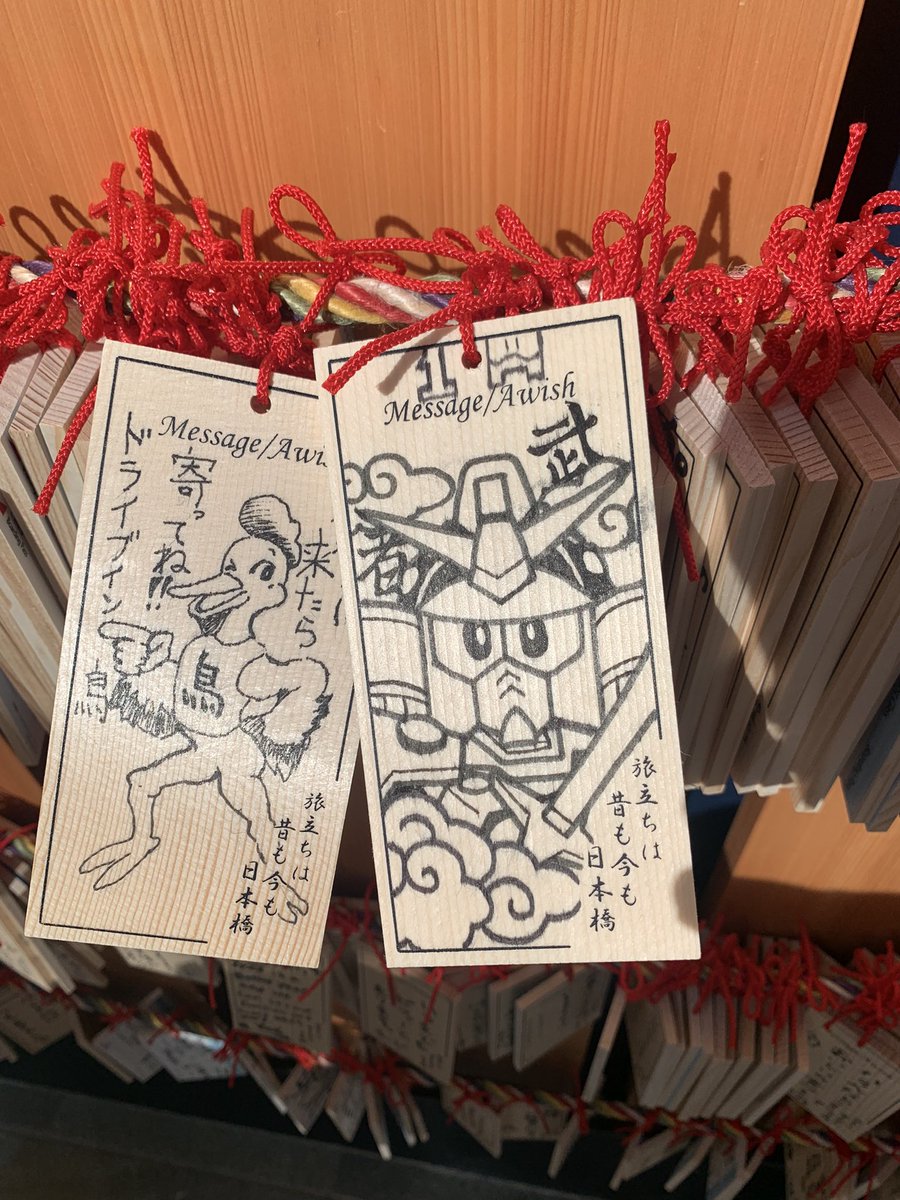羽田空港に絵馬をかけてきました 願掛けなのに1人は武者頑駄無、1人はドライブイン鳥の宣伝描いてる・・・ なんだコイツら(自問自答)