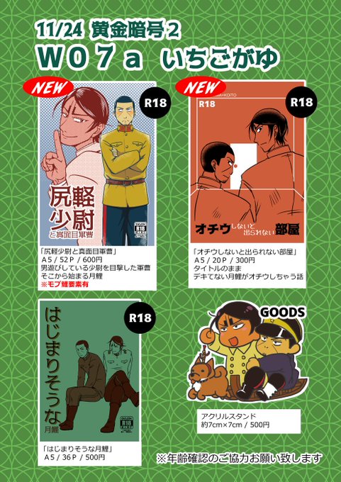 #黄金暗号スペース報告会 東8 w7a いちごがゆ 月鯉新刊2種、既刊1種、アクスタ1種でお待ちしております。 あと時間のある限り何か…