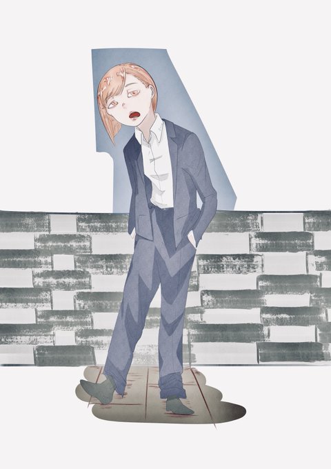 100日チャレンジ、57日目、1日1顔 ロリ×スーツ ロリっ子にこそこういうかっちりした服を着せたい 友達宅の壁がこういうレンガっぽい壁紙ですごくシャレていたのをふと思い出した…そんな落書きでしたわ #100日チャレンジ #rkgk #絵描きさんと繋がりたい #illustration