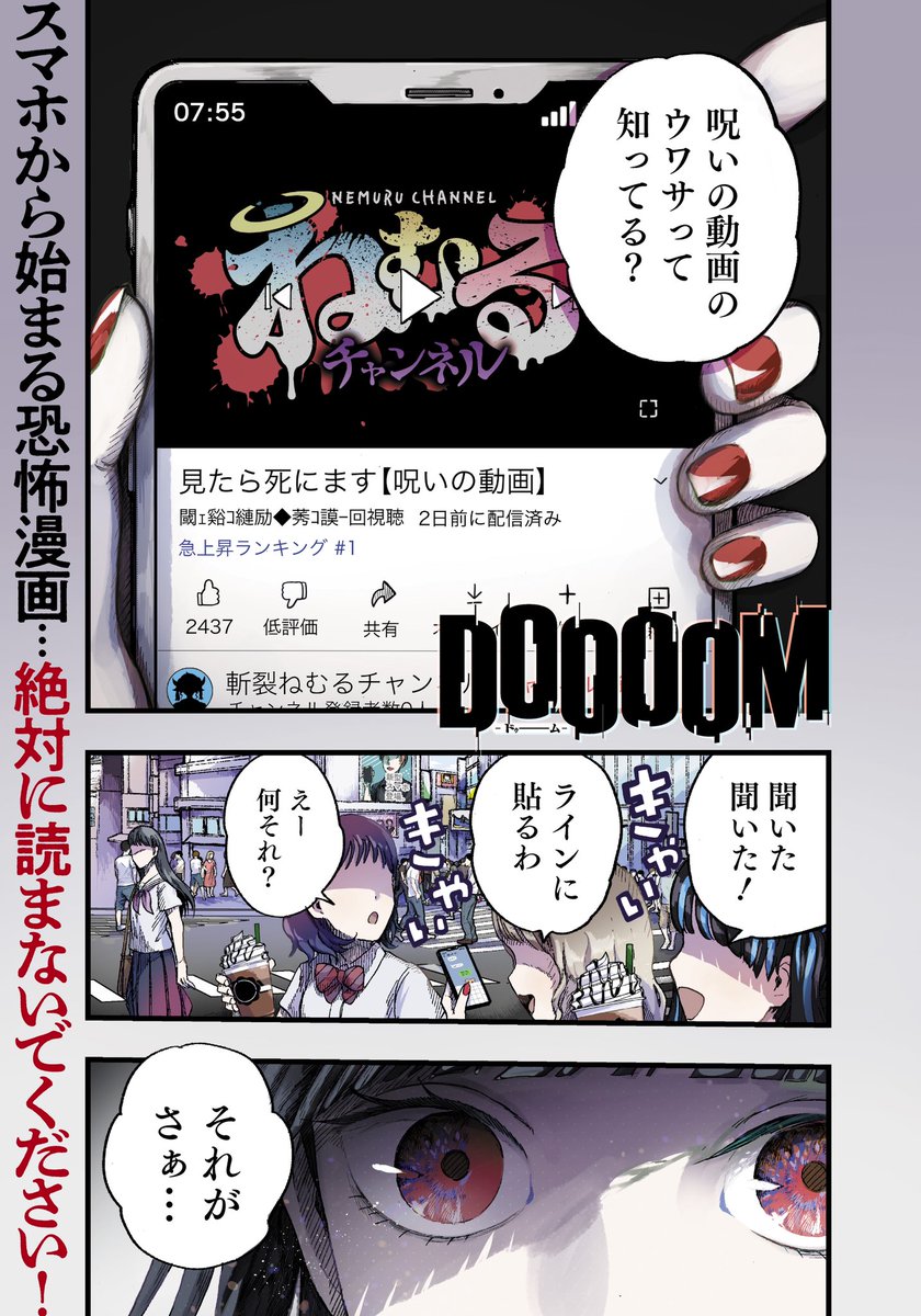 【新連載告知】 本日より公開!新連載ホラー「DOOOOM-ドゥーム-」始まります! 第一話「呪いの動画・前編」 となりのヤングジャンプ:tonarinoyj.jp/episode/326975… ヤンジャン!: ynjn.jp/app/title/5148…