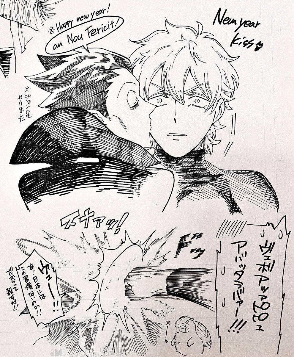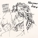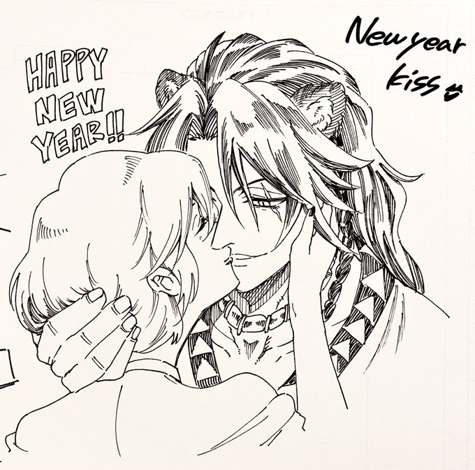 21 391 【twst/落書き:レオ監】 今年はニューイヤーキスをさせてみました‼︎‼︎‼︎ 安定の🦁🌸結婚後‼︎‼︎‼︎ (時間なくってオールアナログです) 22/01/01 00:03