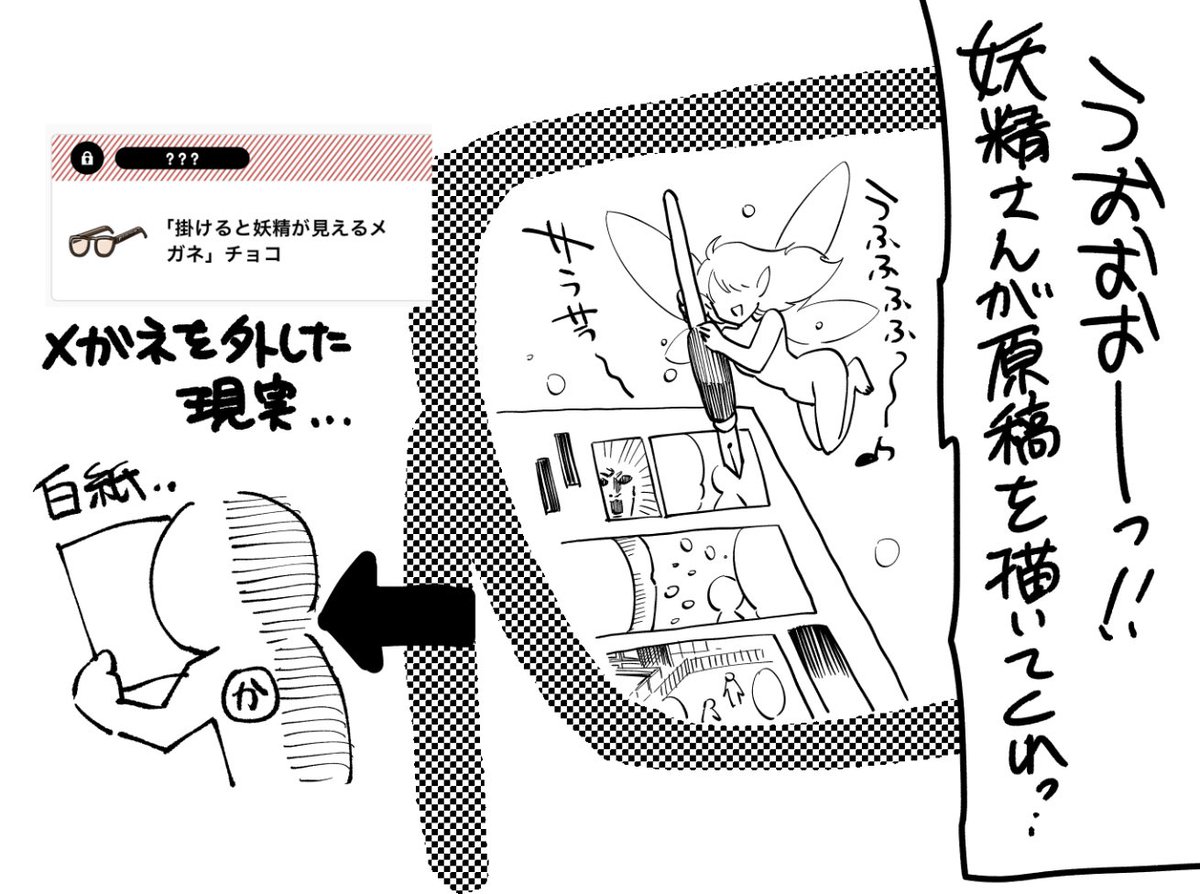 【落書き】 バレンタインチョコありがとうございます😭✨ いただいた内の一つ…こういうことかなって思ってしまった… いやちがう‼︎ 妖精さんは私が寝てる間にベタトーンも集中線もすべてやって… 嘘じゃないっ‼︎妖精はいるもん‼︎ほらっこのメガネをかければそこにっ‼︎‼︎‼︎‼︎