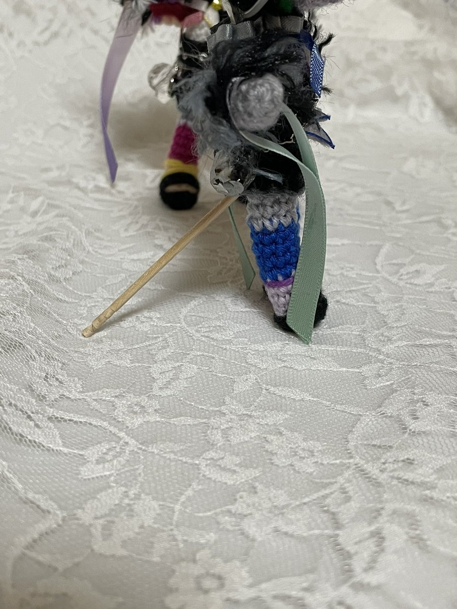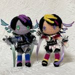 光のシュウさんを編みました🧶 闇のシュウさんと並べてみてもわかる通り凄いカラーリングになってます (4枚目 爪楊枝を刺して立たせてます) #YaminoArt #ShuYamino #にじさんじ手芸部