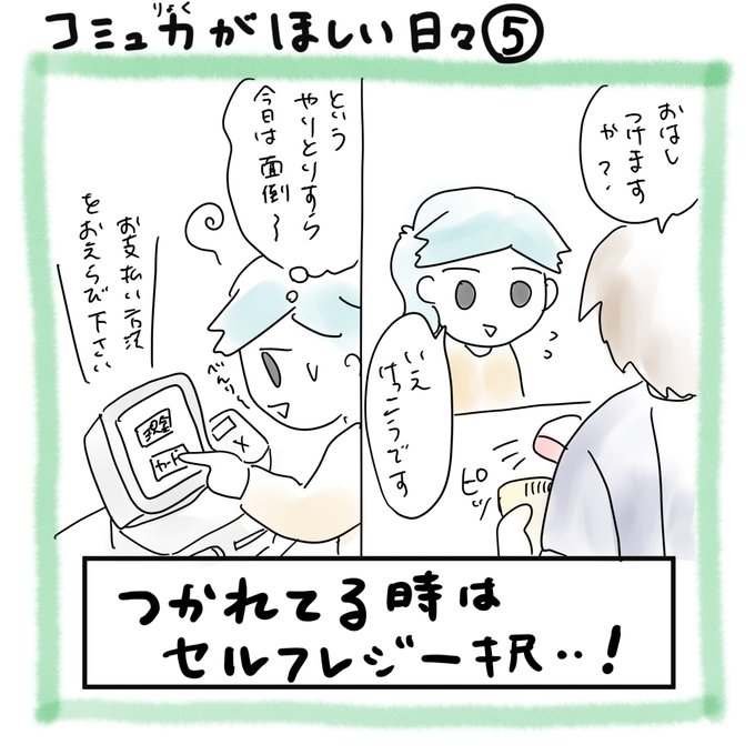 店員さん素通りは申し訳ないので、レジが混んでる時に限りますが💦 人と関わるモードが完全オフになってる時は、セルフレジありがたいです。 #コミックエッセイ #漫画が読めるハッシュタグ #人見知り #コミュ力がほしい日々