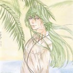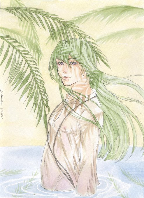 Watercolor painting of Enkidu from #FGO bathed in golden light beneath palm trees. #anime #イラスト #illustration #FateGrandOrder #games