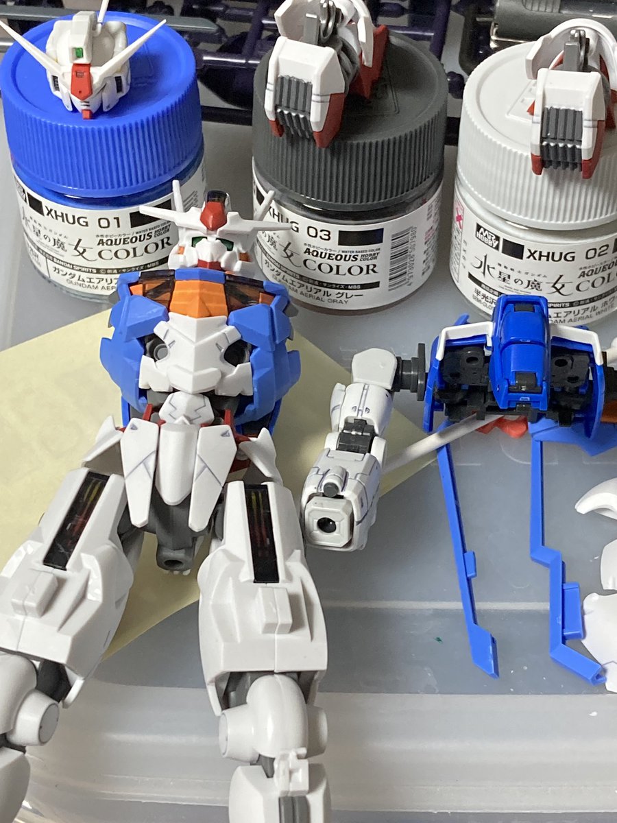 #水星の魔女 #ガンプラ エアリアルだいぶ進みました😉 塗って艶消しして組んで 艶消しも筆塗りだから筆塗り全塗装と言い張れないか…🫠 ついでに放置していたRGゼフィランサスも艶消ししてます😉